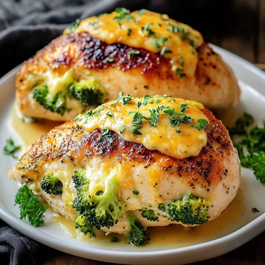 Deliciously moist chicken breasts stuffed with a creamy broccoli and cheddar filling, perfect for family dinners.