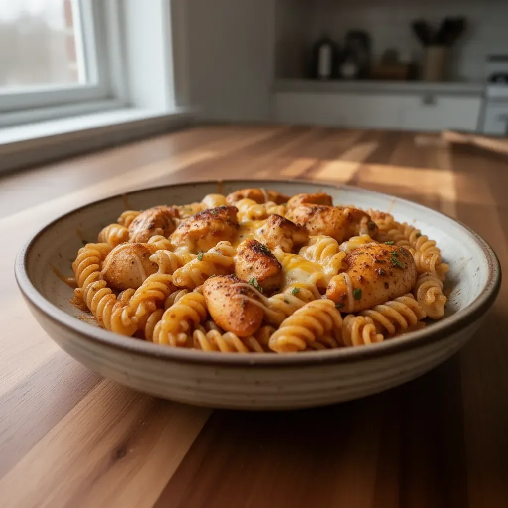 A one-pan meal featuring juicy chicken, creamy cheese sauce, and al dente rotini, packed with bold Cajun flavors.