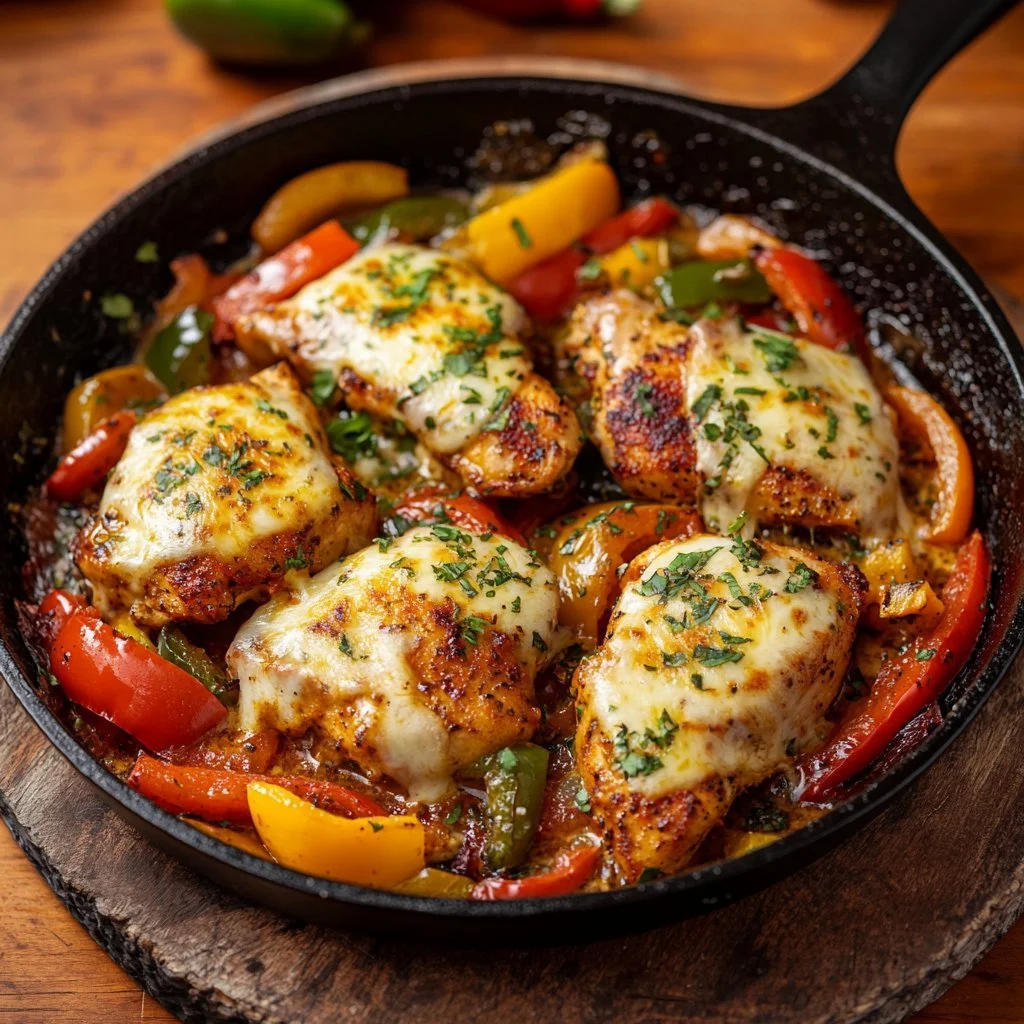 A comforting and vibrant dish combining sautéed chicken, bell peppers, and melted cheese, perfect for sharing with friends and family.