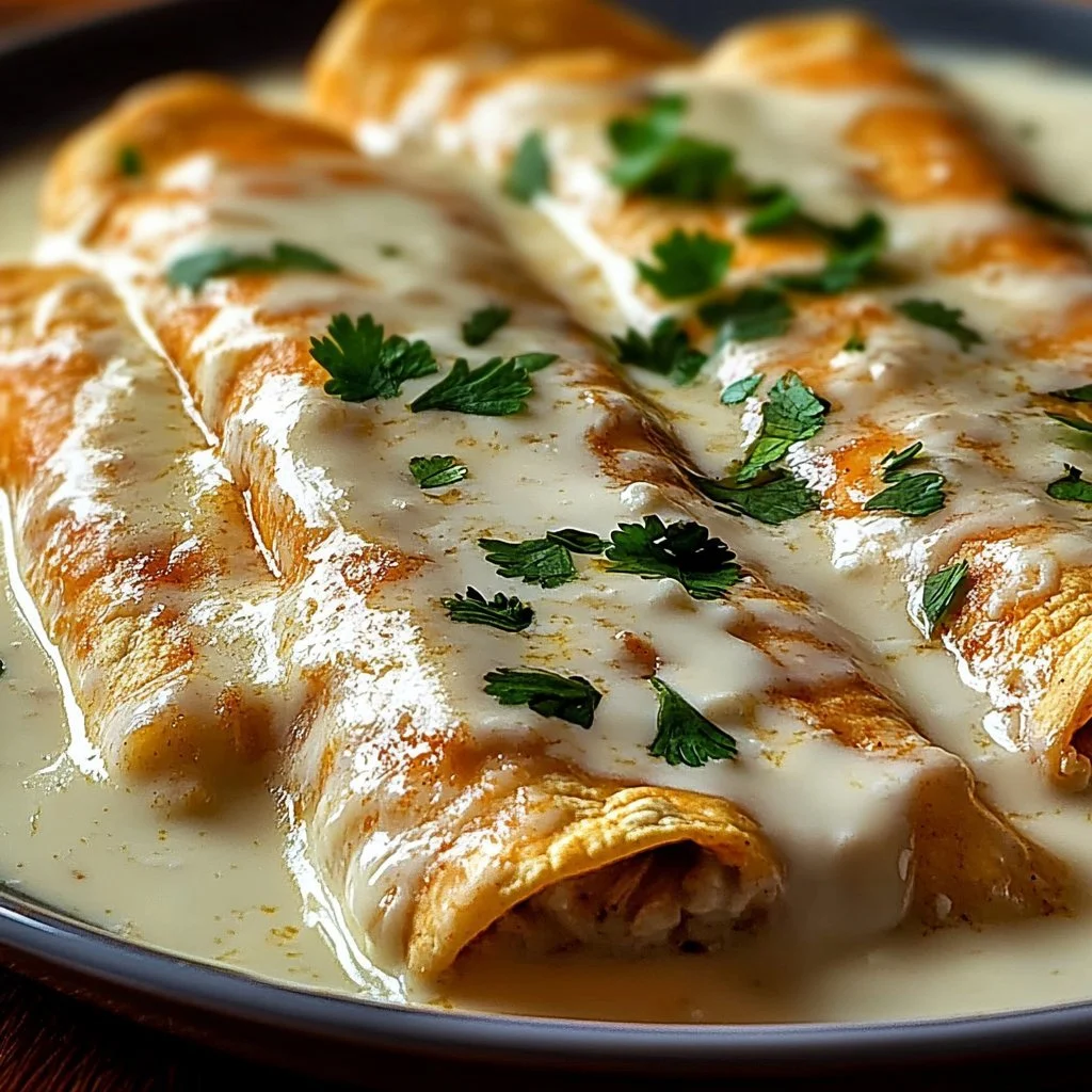 Enjoy savory chicken enchiladas wrapped in soft tortillas and smothered in a creamy sour cream white sauce, perfect for any occasion.