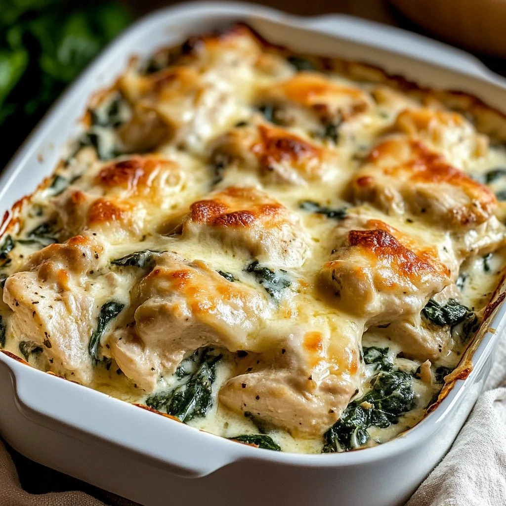 A comforting chicken and spinach casserole featuring creamy cheese and savory flavors, perfect for a weeknight dinner.