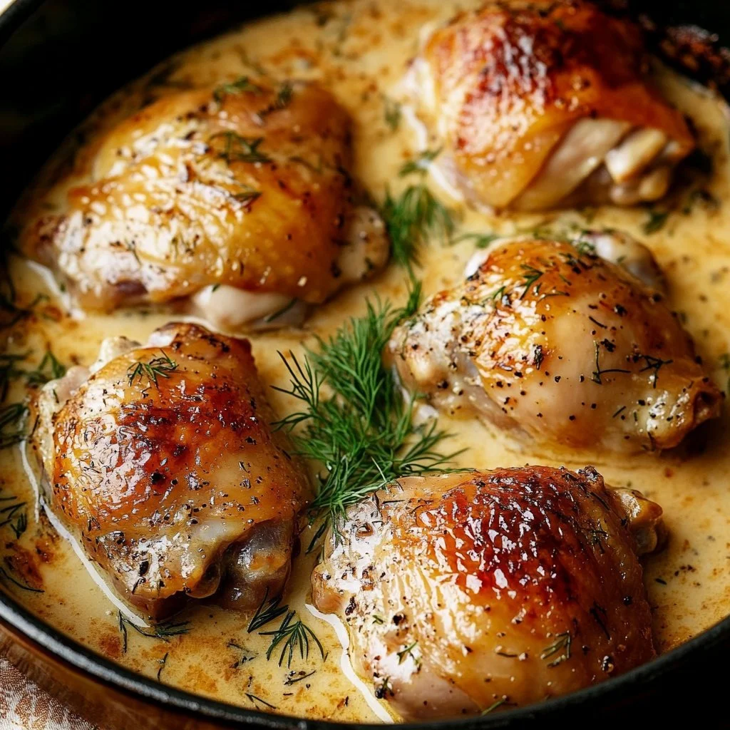 Creamy oven-baked chicken thighs, tender and juicy, enveloped in a rich, luxurious sauce made with heavy cream and Parmesan cheese.