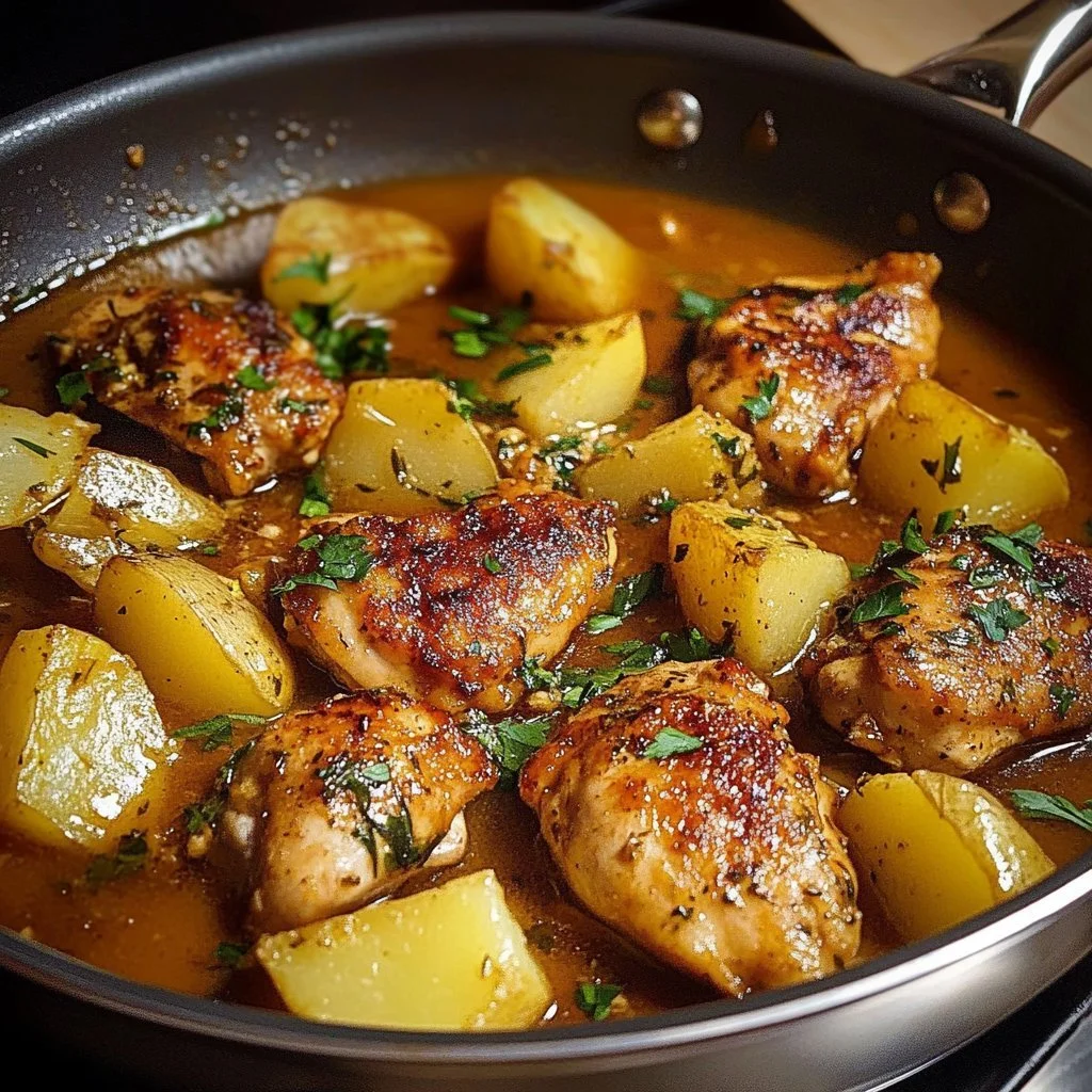 A delightful dish of tender chicken thighs and hearty potatoes marinated in fresh lemon juice, olive oil, and herbs, roasted to perfection for a flavorful meal.