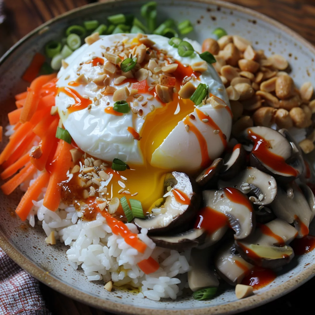 8. Finish the rice bowl by adding the poached egg, scallions, fried shallots, crushed peanuts, and hot sauce if desired, and remember to use the reserved carrot sauce for extra flavor.