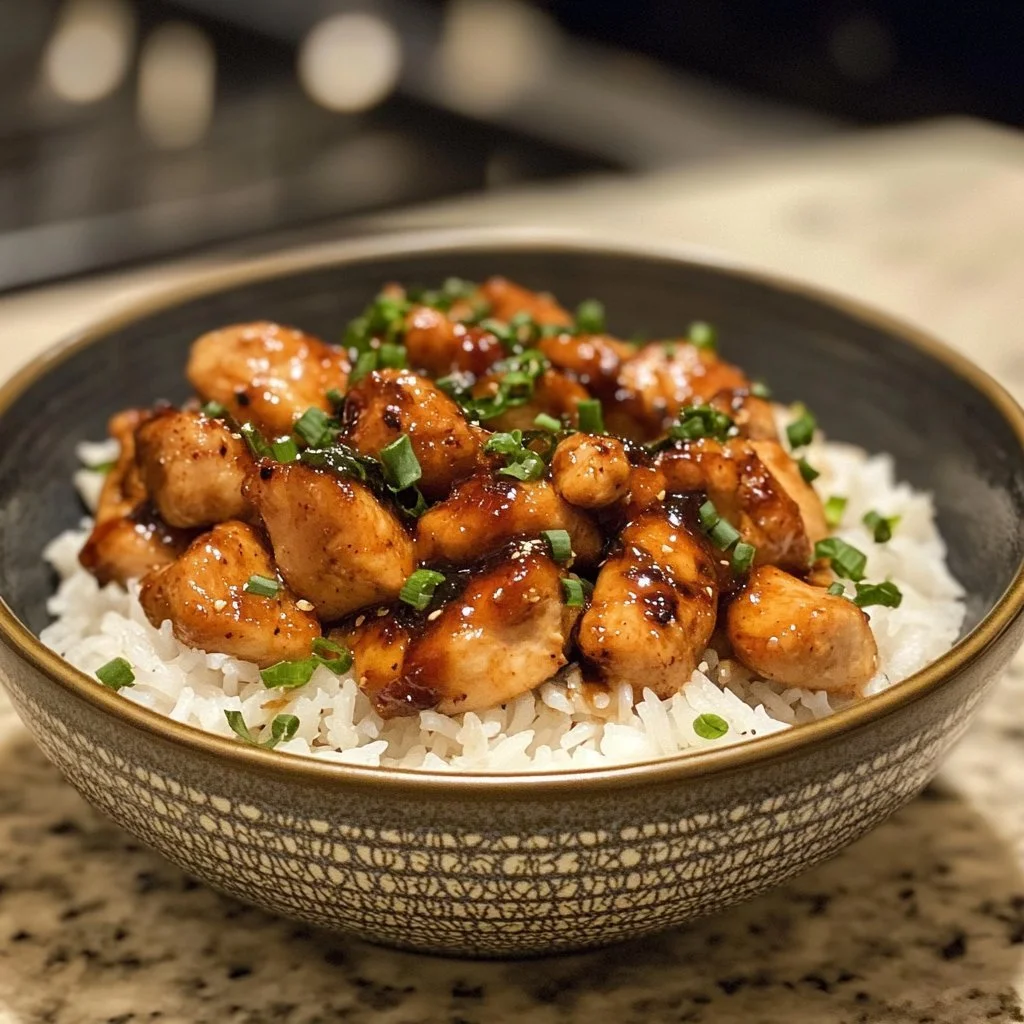 A delightful blend of sweet and savory chicken thighs served over rice, enhanced with BBQ sauce and honey for a comforting meal.