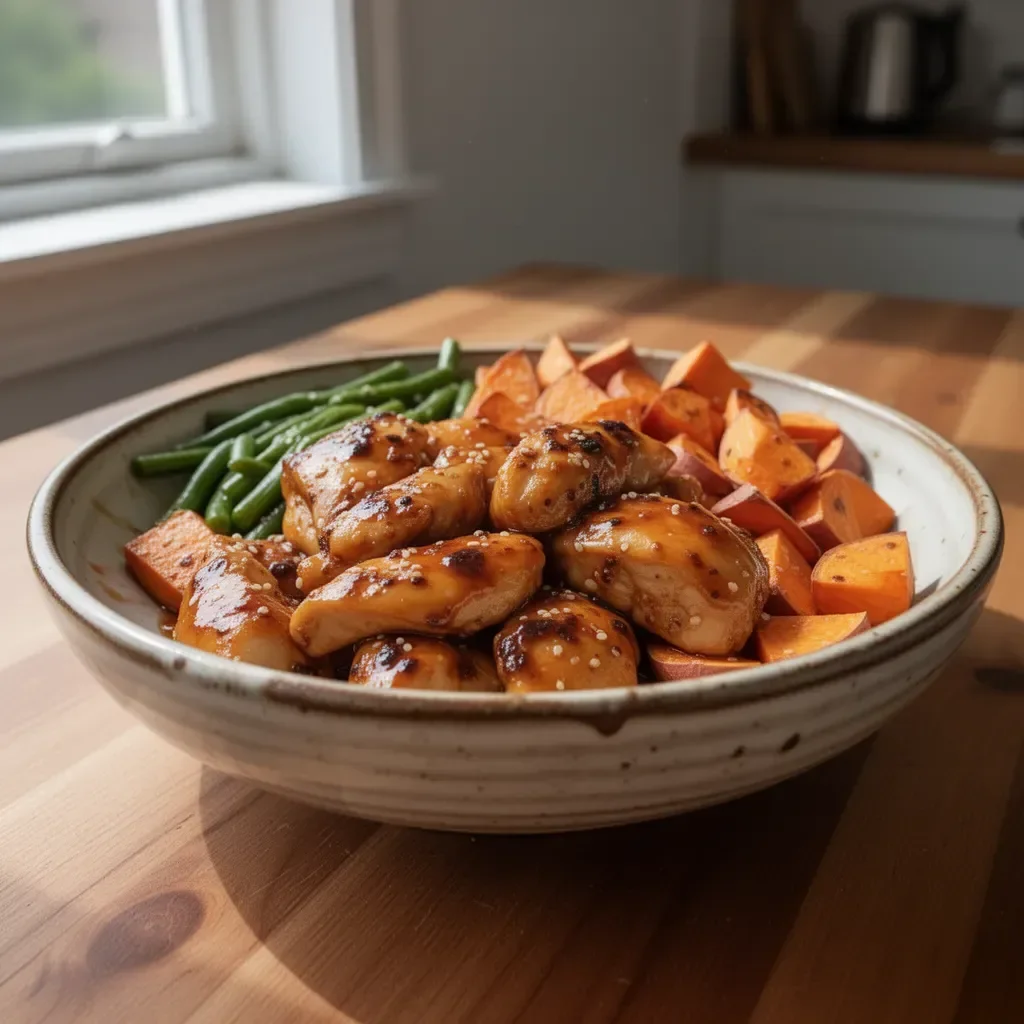 A comforting dish that combines tender chicken, sweet potatoes, and green beans in a flavorful honey garlic marinade, perfect for family dinners.