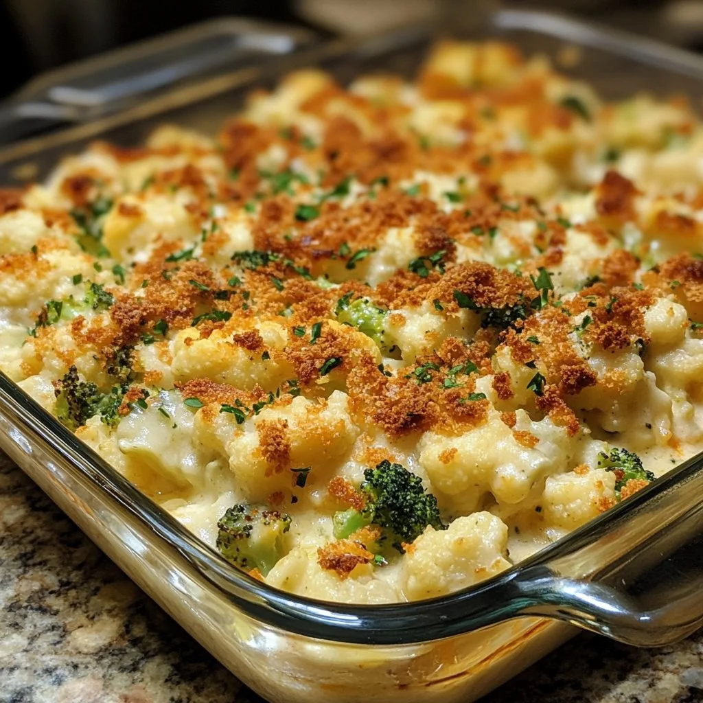 A creamy and cheesy loaded cauliflower and broccoli casserole, perfect as a side or main dish, featuring tender vegetables and a crispy top.