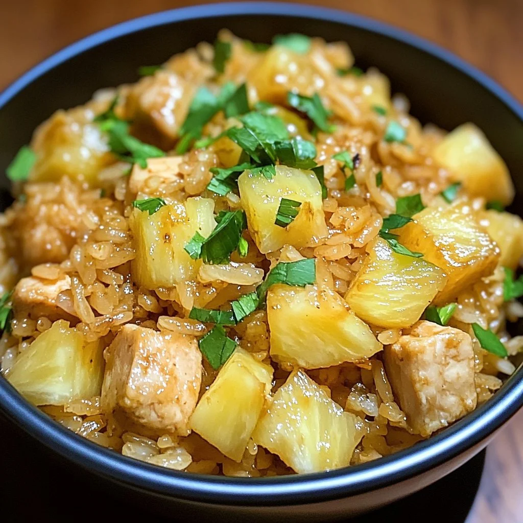 A delightful one-pan dish combining juicy chicken breast, tender jasmine rice, and sweet pineapple, seasoned with garlic and ginger.