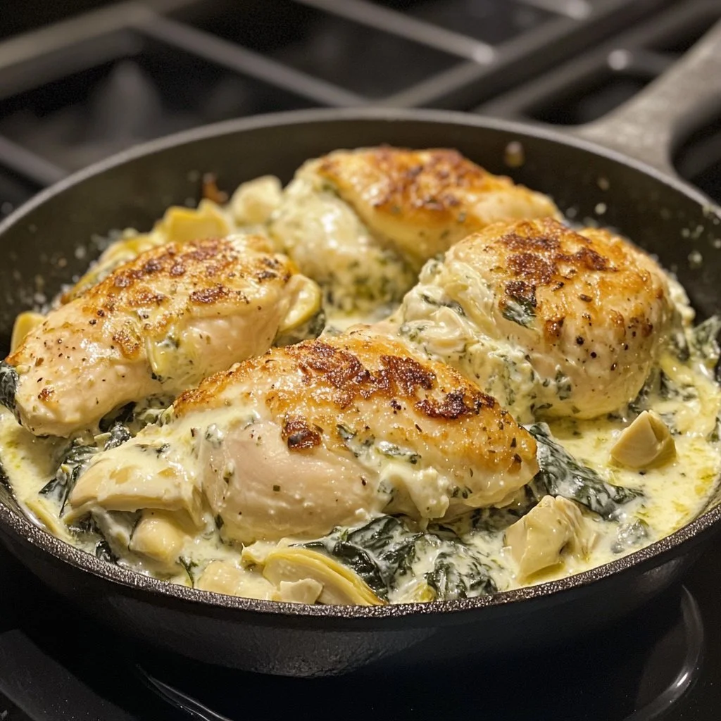 A creamy and flavorful dish combining spinach, artichoke hearts, and a cheesy filling atop tender chicken breasts.