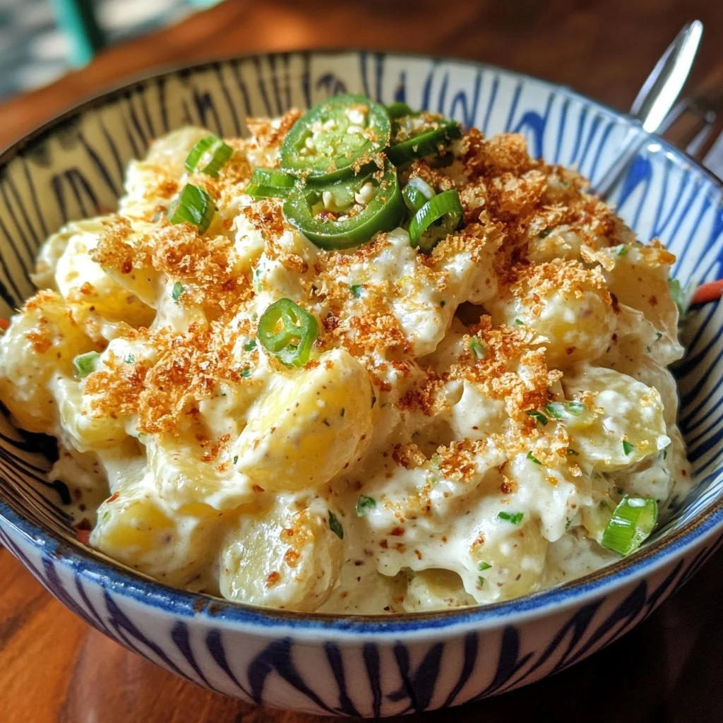 A delicious twist on traditional potato salad featuring creamy mayonnaise, zesty jalapenos, and fresh herbs.