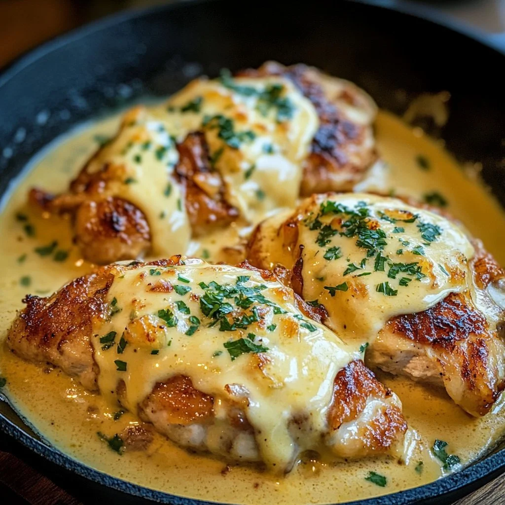 A deliciously simple dish combining tender chicken breasts with a creamy garlic sauce and melted jack cheese.